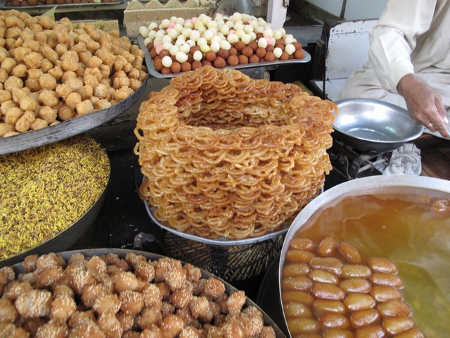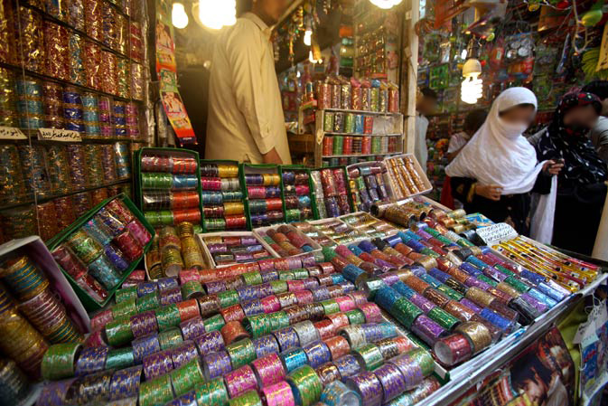 Les bazaars du Pakistan sont des enchevêtrements de ruelles dans lesquelles se bousculent les étals. Pendant les coupures d’électricité, le bruit des générateurs y est insupportable, mais c’est un oasis de fraîcheur pendant les longs mois d’été. Epices, fruits secs, tissu, tailleurs tenant boutique au milieu de la rue, teinturiers affairés à leurs mélanges de couleurs dans des bacs d’eau bouillante, qui font sécher les étoffes au dessus des passants, artisanat de bois et de verre, bijouteries, décorations de mariage, etc… Mais trêve de bavardages, commençons la visite…