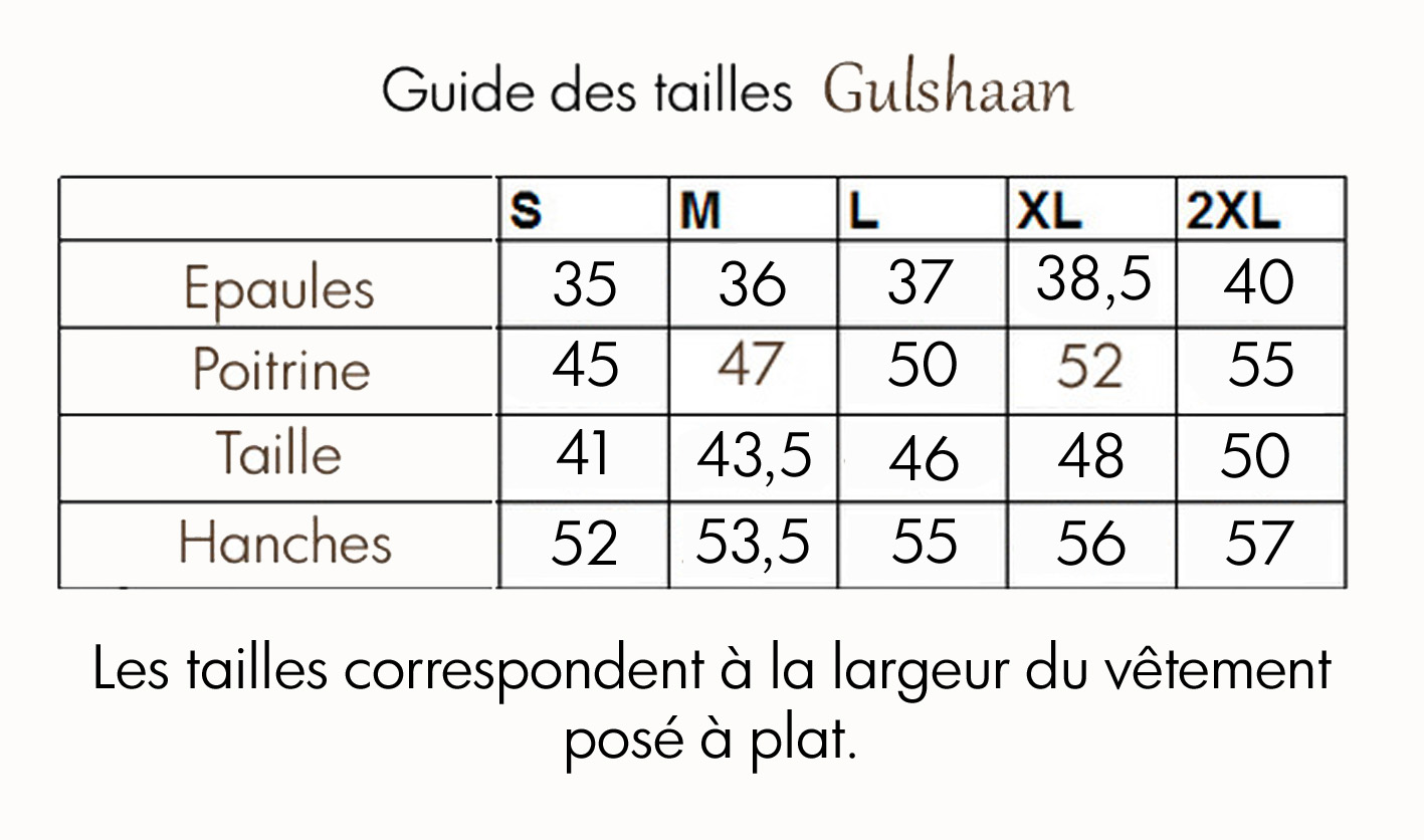 Vous trouverez en bas de cet article la charte des tailles pour cette vente-flash, toutes les mesures correspondent à la largeur du vêtement posé à plat.