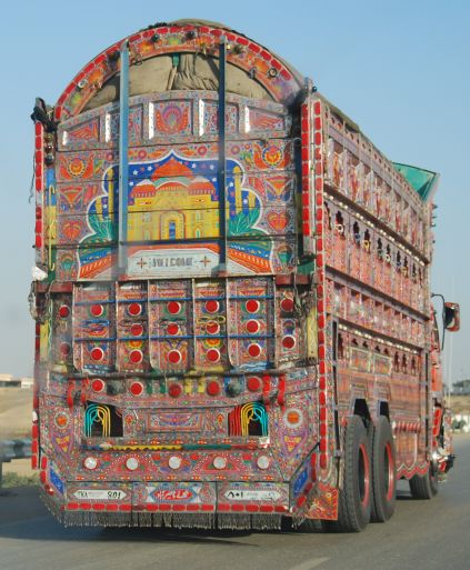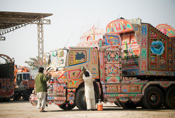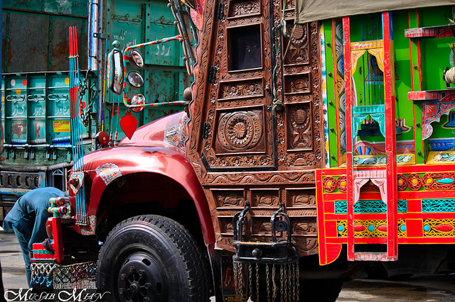 Avec les vêtements des femmes, ce sont eux qui illuminent de leurs couleurs les paysages pakistanais. On les entend arriver de loin, tant les routes cahoteuses secouent ces amas de ferraille colorés, dans un boucan de bruits de fer et de klaxons tonitruant et enroué. Vraies oeuvres d’art, les peintres du truck art passent des jours dans les workshops avant de livrer leur trésor à un nouveau propriétaire, qui le choiera avec amour tout au long de sa vie de camion. Il deviendra sa fierté, son bien le plus cher. Même l’intérieur est décoré de bois sculpté et de lumières colorées.