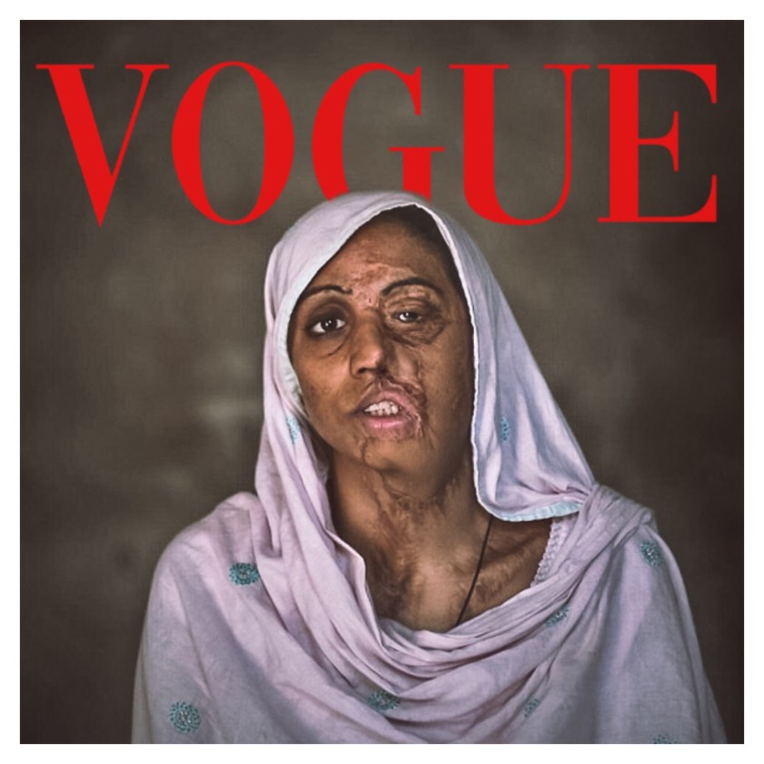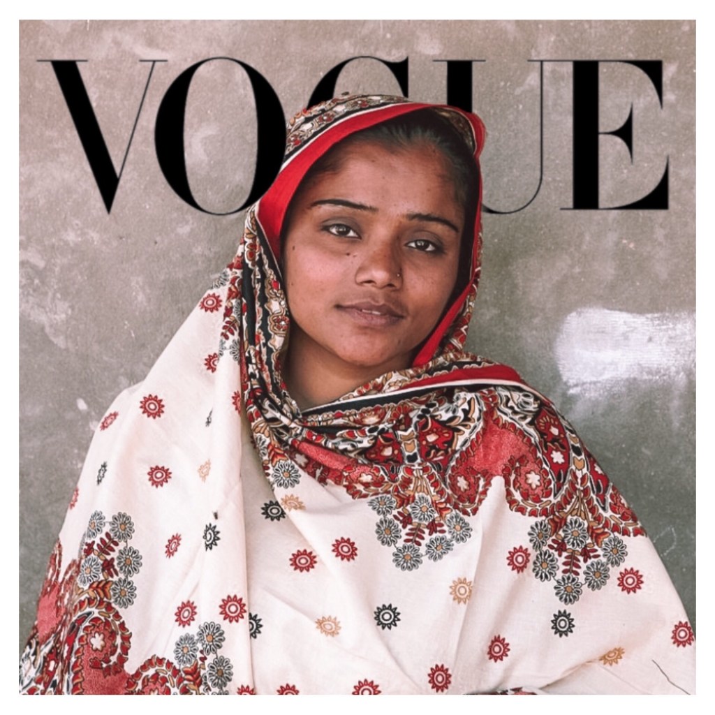 Deuxième femme, deuxième thématique. Le Pakistan est le troisième pays au monde en nombre de réfugiés accueillis sur son sol, après la Turquie et la Colombie, et la quasi-totalité de ces réfugiés sont bien évidemment des afghans. Après quarante ans de conflit afghan, certaines familles ont vu des générations naître et grandir sur le sol pakistanais, mais ne peuvent obtenir la nationalité, et n’ont toujours pas les mêmes droit que les autres en terme de mobilité, d’éducation, d’emploi et de logement entre autres. Dans les camps où vivent les plus récemment arrivés, la situation est dramatique, comme dans tous les camps du monde, à la différence près que la culture pashtoune, ethnie dont sont issus la plupart des réfugiés afghans, interdit aux femmes de se montrer en présence d’hommes, leur impose une non-mixité stricte et un effacement de l’espace public. La société pashtoune organisée comme tel y trouve un équilibre qui occasionne un grand respect de ces femmes qu’on ne voit jamais mais qu’on honore. Dans le l’enfer des camps par contre, la réalité devient toute autre, et comme partout dans le monde, les femmes sont les premières victimes des migrations. Enfermées en permanence dans le périmètre réduit de leur tente devenue prison, exposées aux énormes chaleurs et au froid, forcées à l’immobilisme et sans vie sociale, dépendant entièrement de leurs enfants même en bas âge pour presque tout, elles développent plus que tous des maladies psychologiques et souffrent presque toutes de dépression. Cette femme invisible est en couverture de notre deuxième Vogue Challenge.