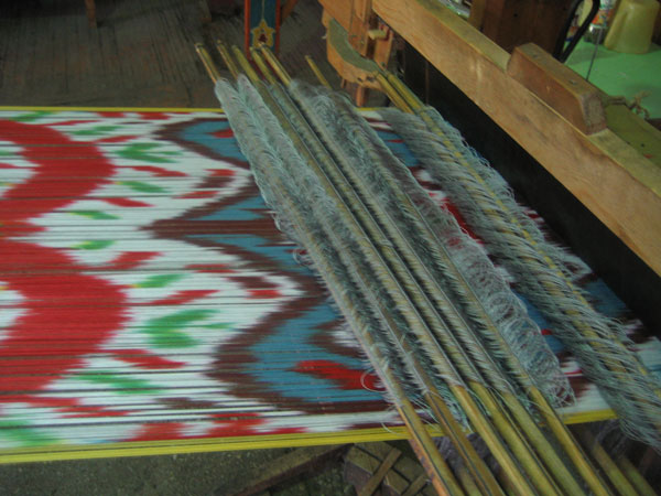 Puisqu’en ce moment, nous parlons Route de la Soie et tissus imprimés, nous devons parler de cet imprimé caractéristique qui a longtemps été l’un des symboles des villes de Bukhara et Samarqand en Ouzbekistan, mais aussi de Kashgar en Chine occidentale. Plus que cela, ces imprimés continuent à influencer les imprimés des collections de tissu en Asie du Sud et du Sud-Est, comme une trace du passé… Initialement, le mot Ikat vient d’Indonésie « attacher, nouer », où il existe une forte culture de cette pratique. Ce mode de tissage et de teinture est également fortement pratiqué en Inde et au Japon notamment, mais également en Amérique Centrale et en Amérique du Sud. Cette appellation vient du fait que les fils sont teints avant d’être tissés. On fait des noeuds aux endroit qui doivent rester incolores pour que la teinture ne les atteigne pas, avant de plonger le tissu dans la teinture. Les couleurs sont apposées à intervalles précis, de sorte qu’au moment du tissage, les motifs apparaissent par la juxtaposition des parties colorées du fil. Les …